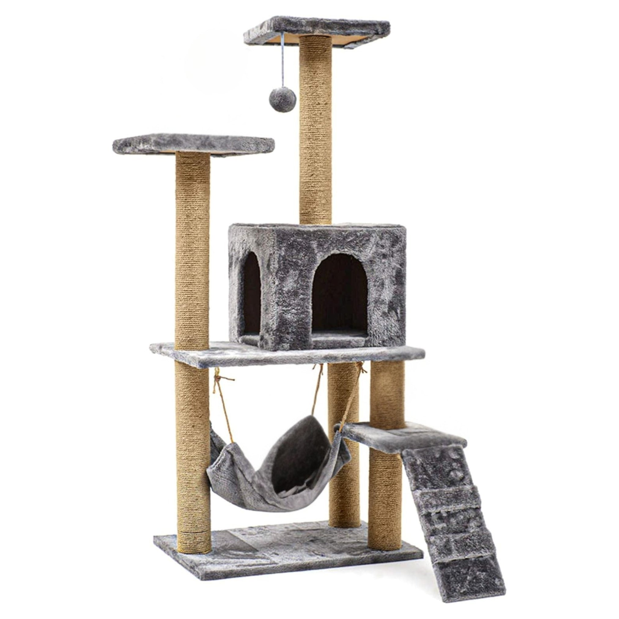 Centre d’Activité Multi-Niveaux : Trois étages pour grimper, sauter et se reposer. Inclut un hamac douillet, une maisonette fermée et une balle suspendue.